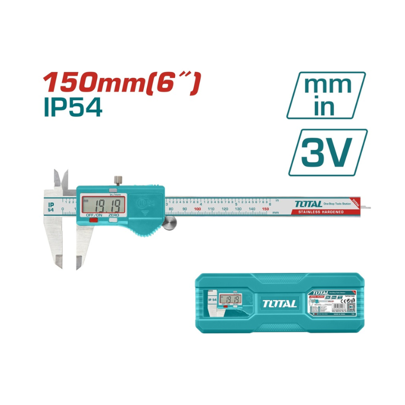 Le pied à coulisse numérique TOTAL 150mm (TMT321506) est un outil de mesure précis et fiable, idéal pour des relevés rapides en millimètres ou pouces. Il offre une résistance IP54 et une lecture fine à 0,01mm, garantissant performance et durabilité pour les professionnels.
