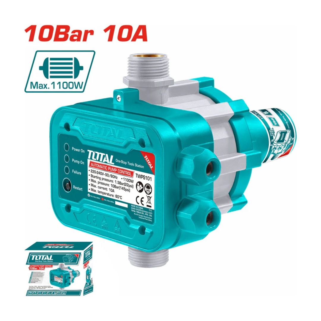 La commande de pompe automatique TWPS101 TOTAL permet de démarrer et d’arrêter automatiquement une pompe à eau selon la pression. Elle protège la pompe contre le fonctionnement à sec et assure une utilisation fiable pour l’irrigation domestique, l’arrosage et l’alimentation en eau.