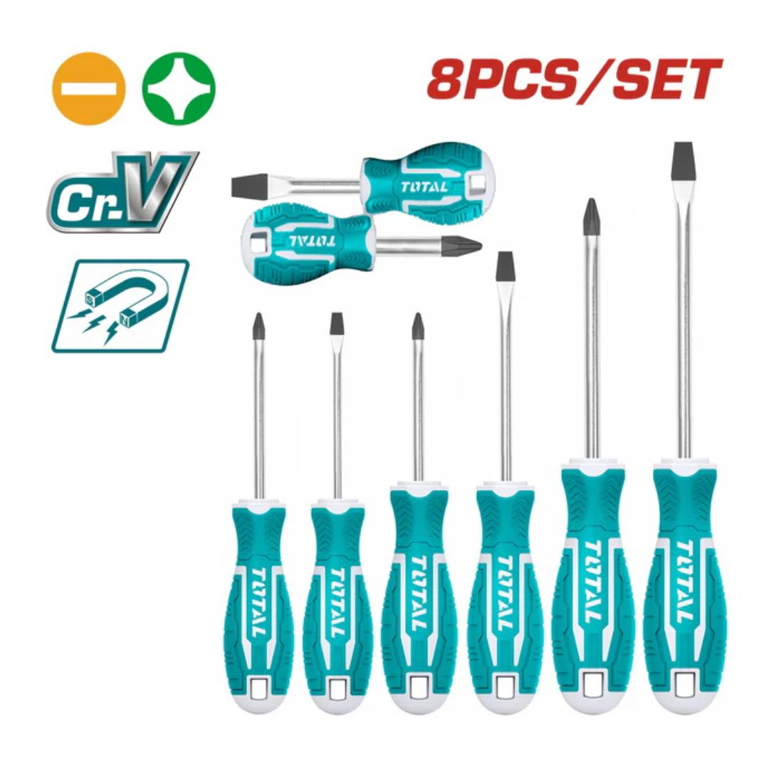 Le jeu de tournevis TOTAL THT250608 est un ensemble manuel de 8 tournevis polyvalents pour usages généraux (bricolage, mécanique légère, électricité, etc.). Chaque outil est fabriqué avec une tige en acier Chrome‑Vanadium (Cr‑V) résistante à l’usure, et possède une pointe magnétique pour faciliter le vissage/dévissage. L’ensemble comprend tournevis plats (SL) et cruciformes (PH) de différentes dimensions pour couvrir la plupart des besoins courants. Il est livré dans un support/blister prêt à accrocher pour un rangement ordonné.